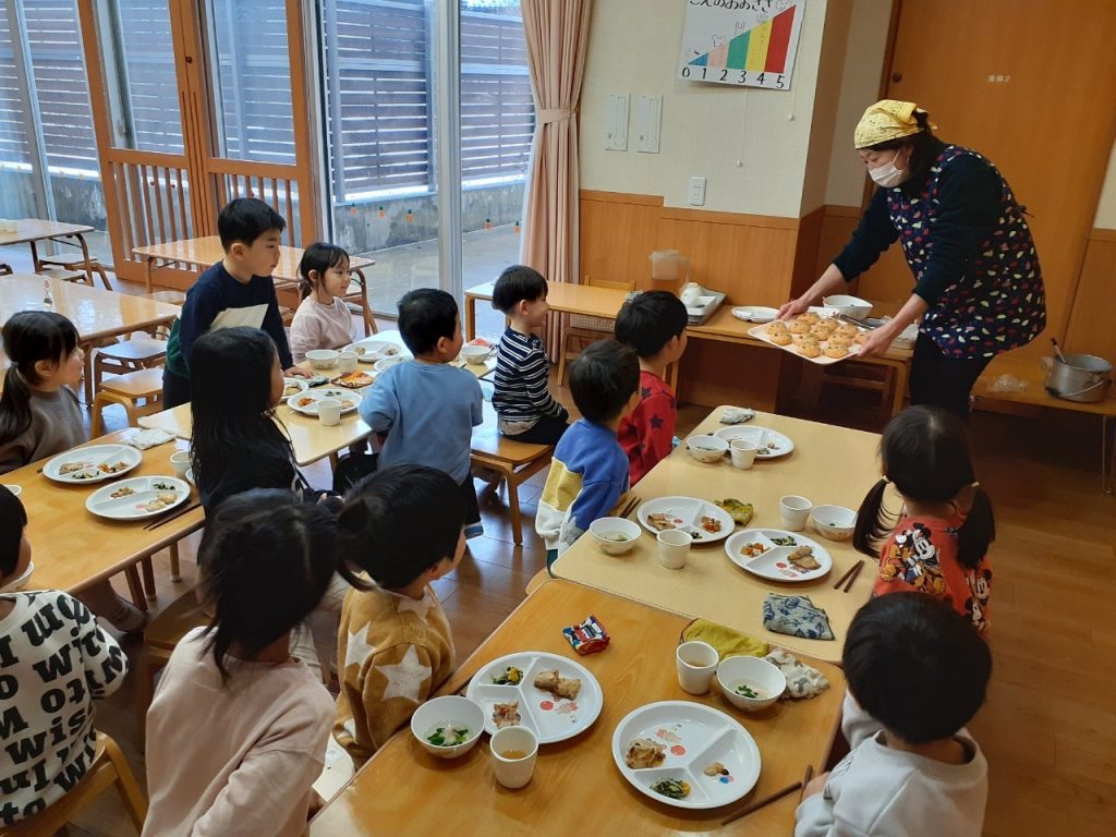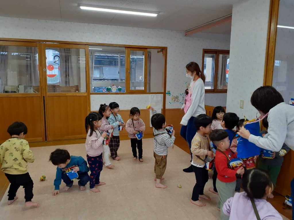 ホールで各クラスの豆入れを紹介したり、節分の由来についての紙芝やパネルシアターを見た後、お部屋やホールで豆まきを楽しみました。