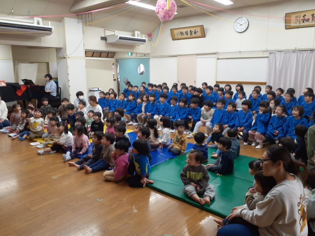 まずは各クラスが作ったひな祭り製作の紹介。以上児さんは、どのように製作したかも発表してもらいました。