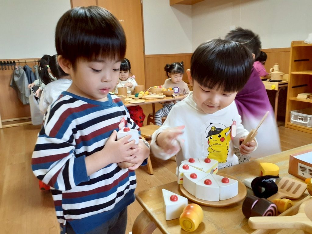 2025.04.11 【さくら組・あやめ組】活動の様子です 良いお天気の時には戸外で思いきり身体を動かしたり、室内でも好きな遊びをじっくりと楽しんだりしています。 その中で友達や保育教諭とのやりとりもたくさん楽しんでいます。