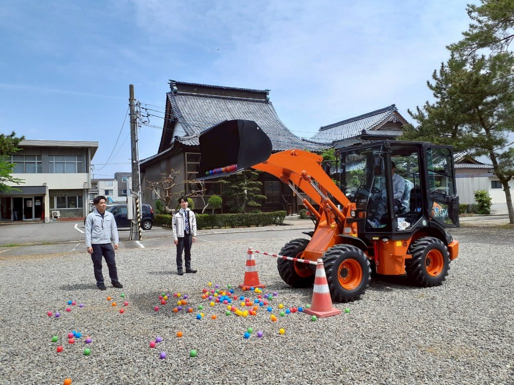 境内では、実際に重機‟ホイールローダー”を間近で見て、ボール入れや乗車体験を楽しんだ子ども達。