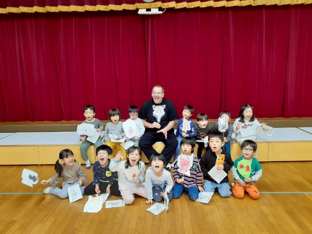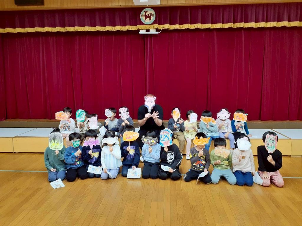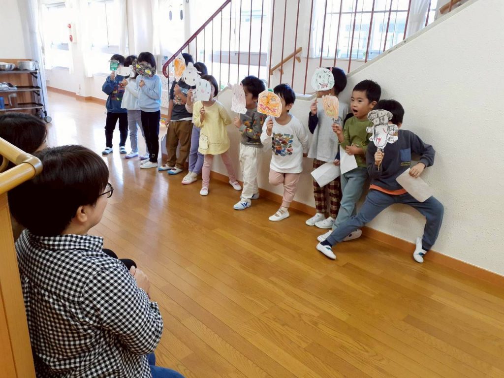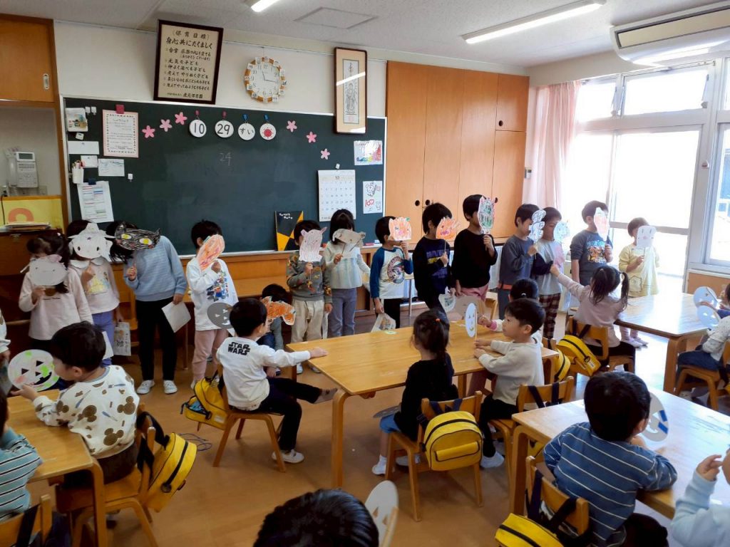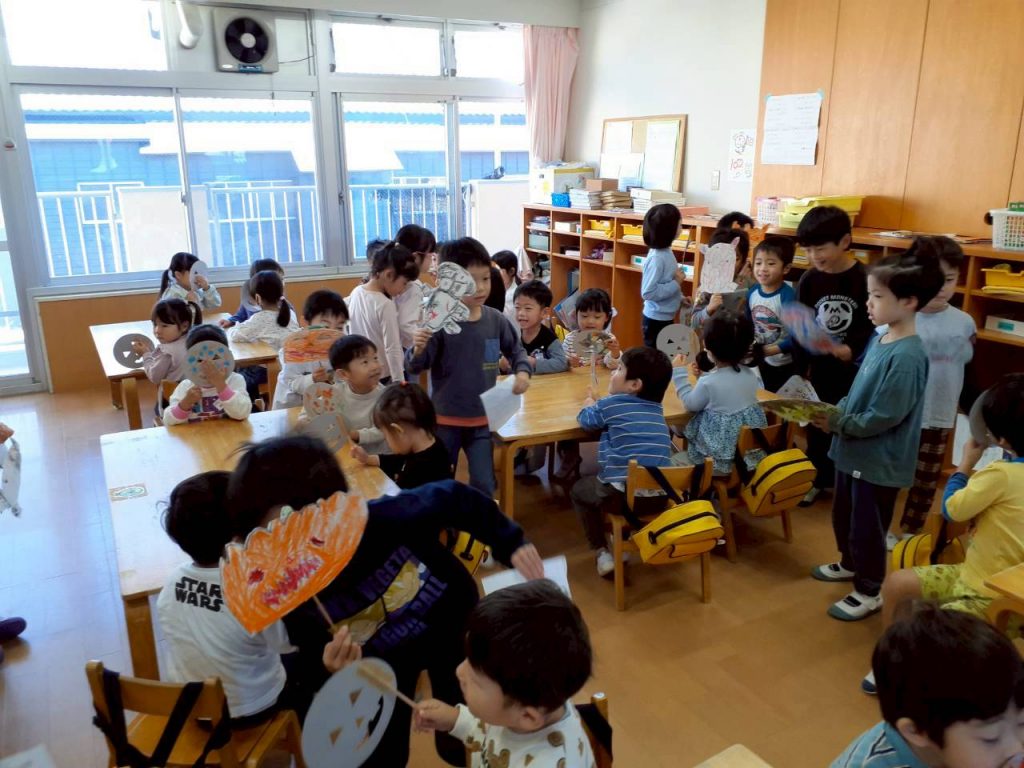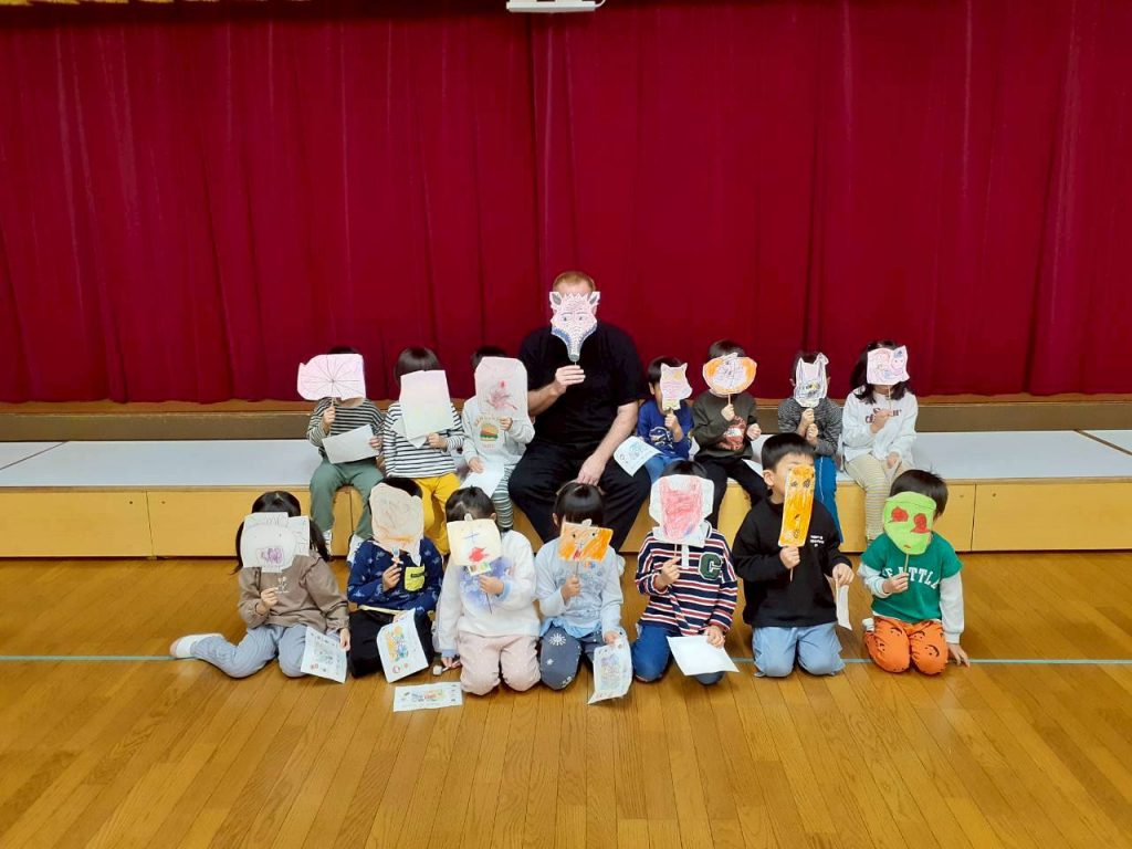 ジム先生からハロウィンの由来を教えてもらった後、オバケのお面を作り、各クラスを回りました。