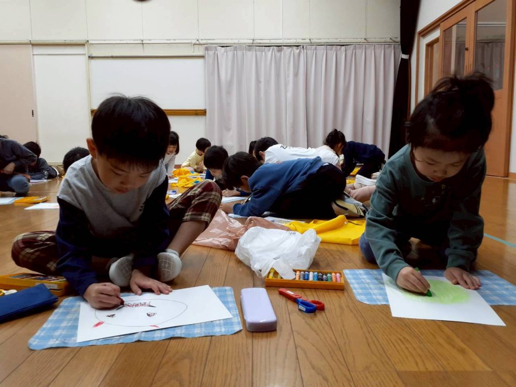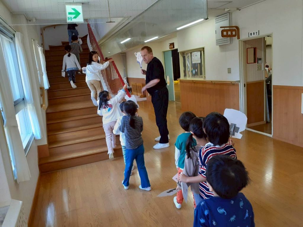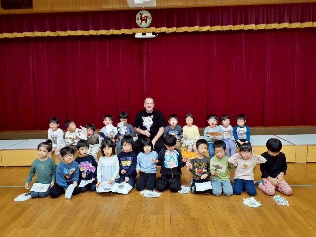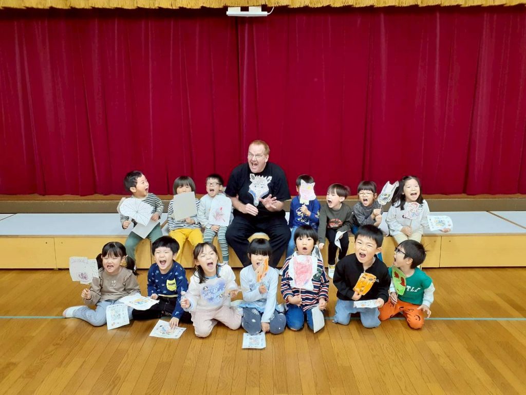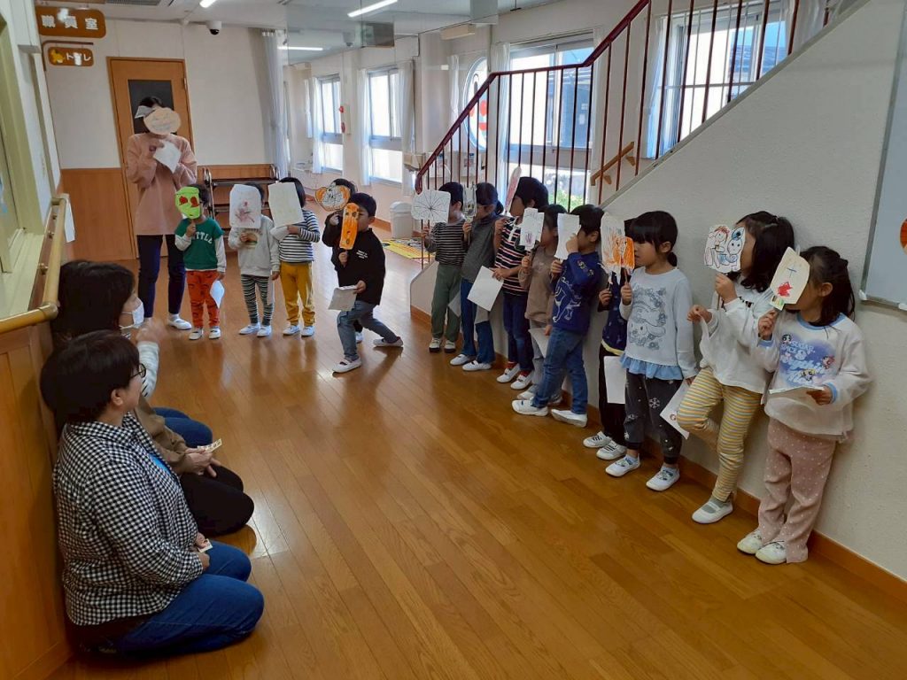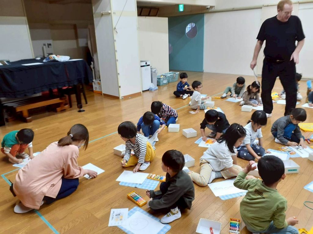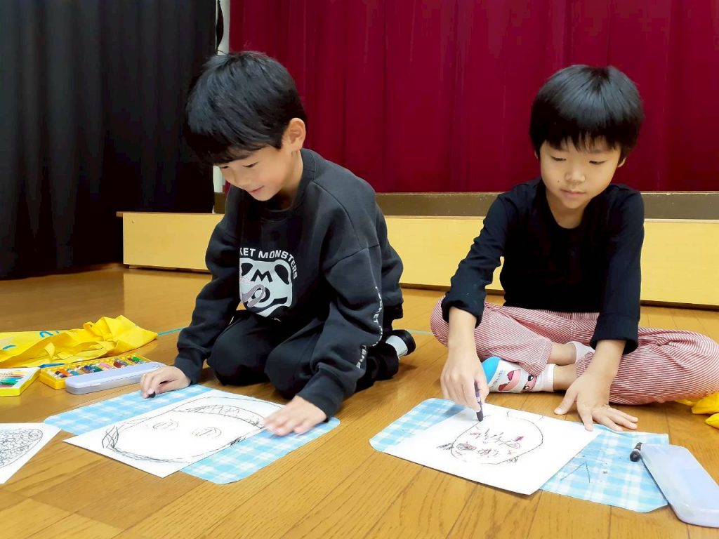 ジム先生からハロウィンの由来を教えてもらった後、オバケのお面を作り、各クラスを回りました。