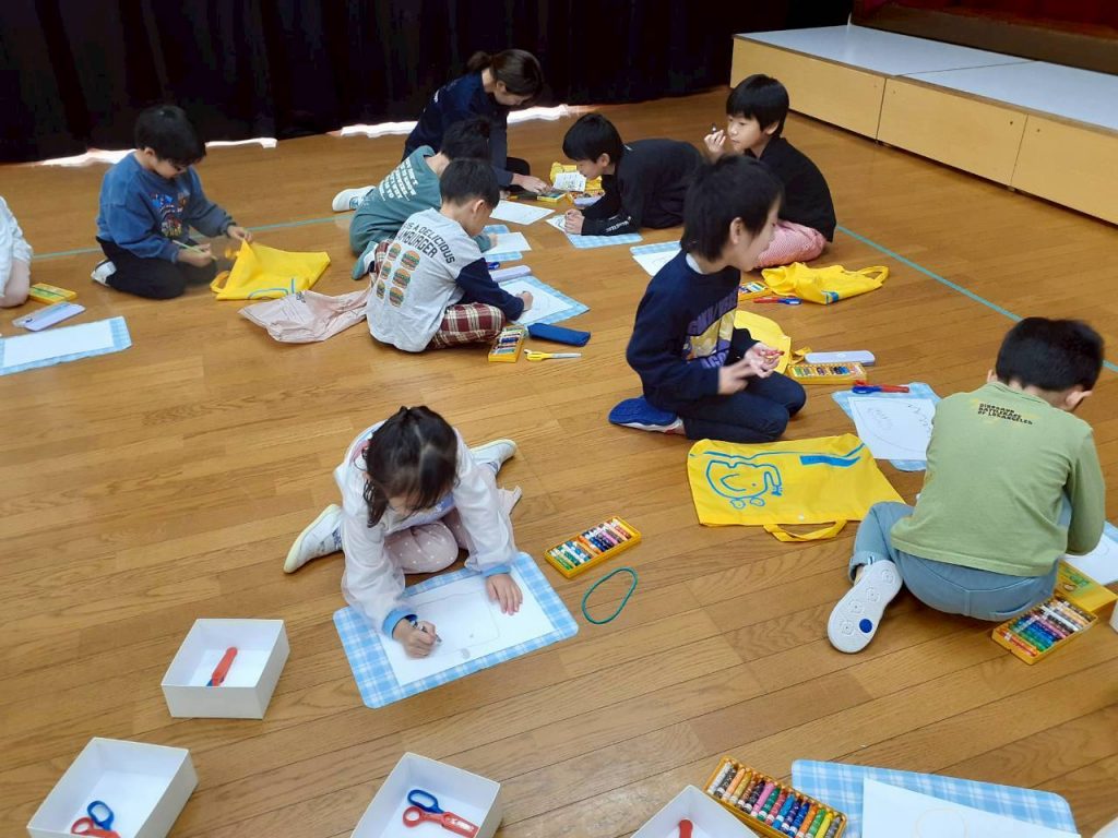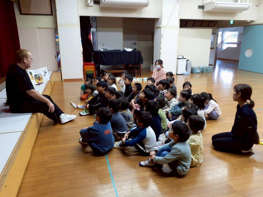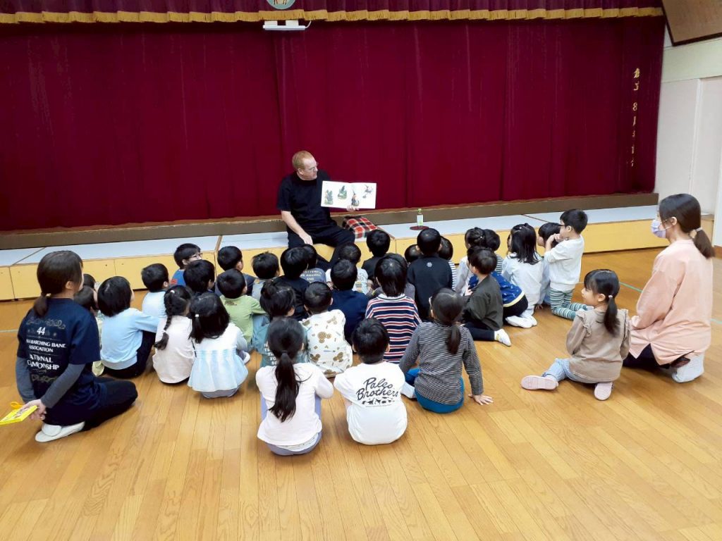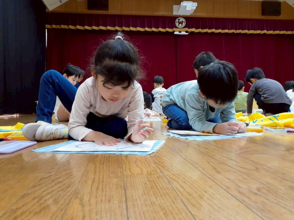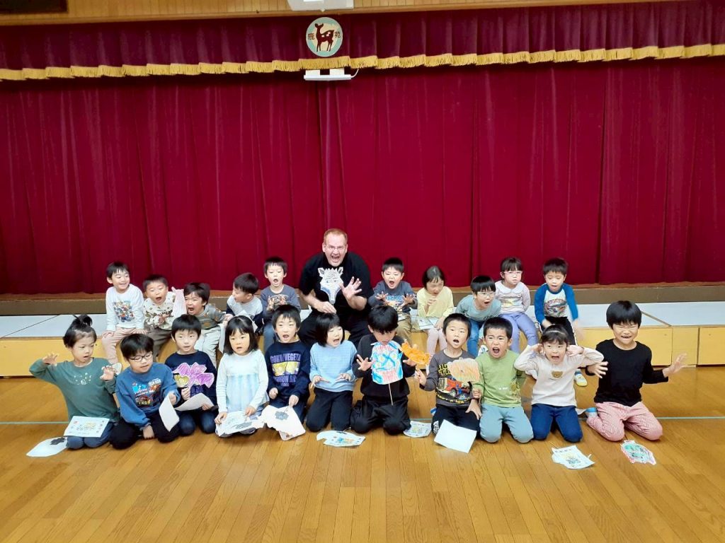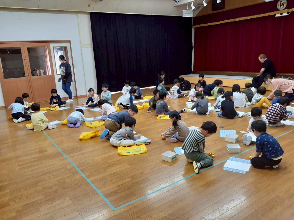 ジム先生からハロウィンの由来を教えてもらった後、オバケのお面を作り、各クラスを回りました。