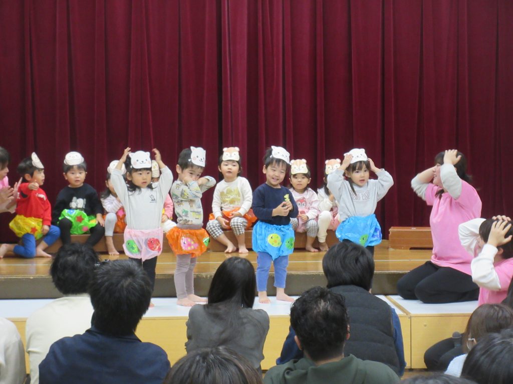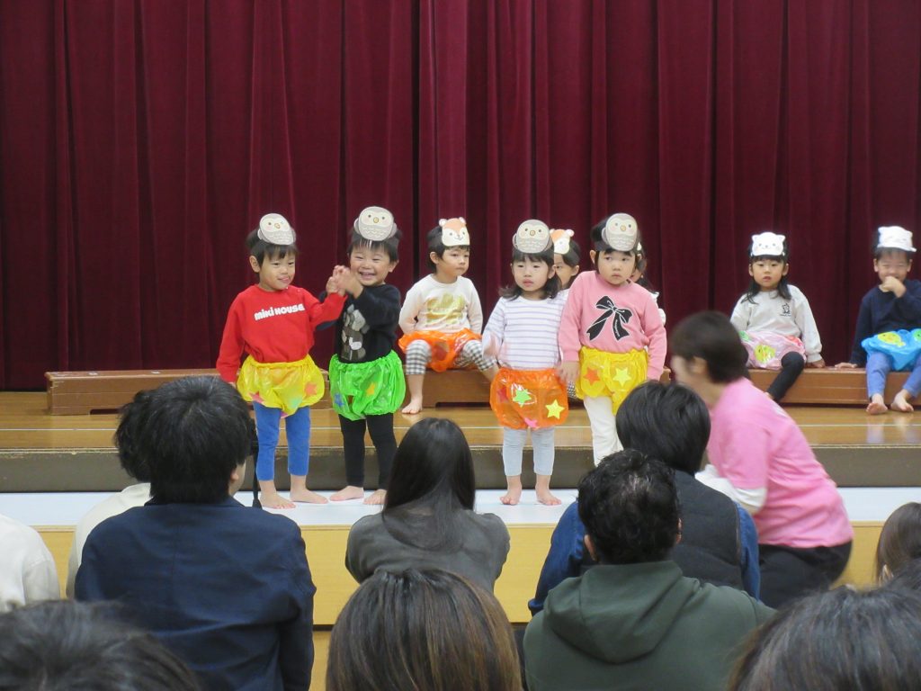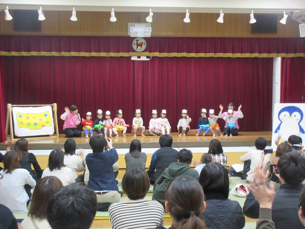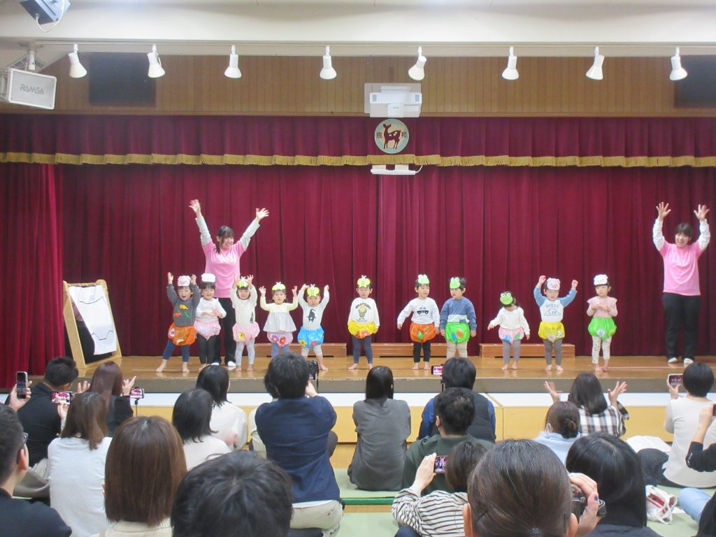 ステージ上では、お家の方を見つけて嬉しそうに手を振るお子さんや、緊張からか動きが止まってしまったお子さん等、様々でしたが、みんな最後まで頑張って発表していました。
