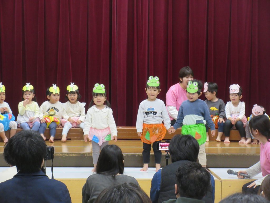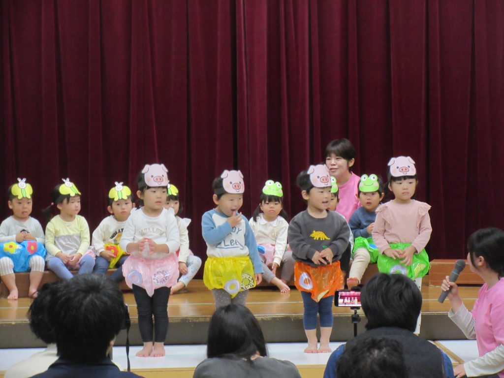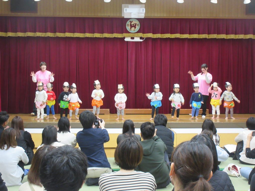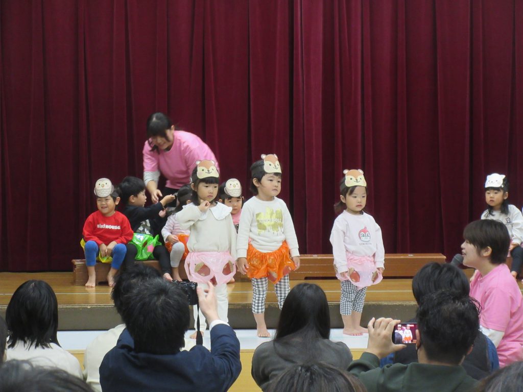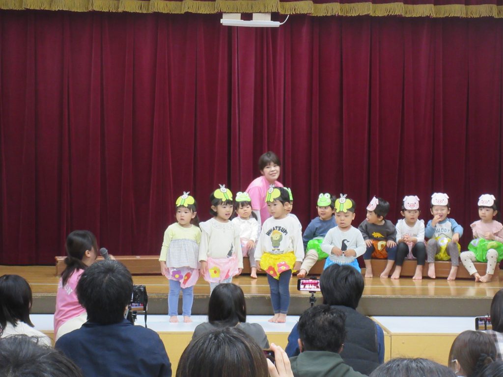 ステージ上では、お家の方を見つけて嬉しそうに手を振るお子さんや、緊張からか動きが止まってしまったお子さん等、様々でしたが、みんな最後まで頑張って発表していました。