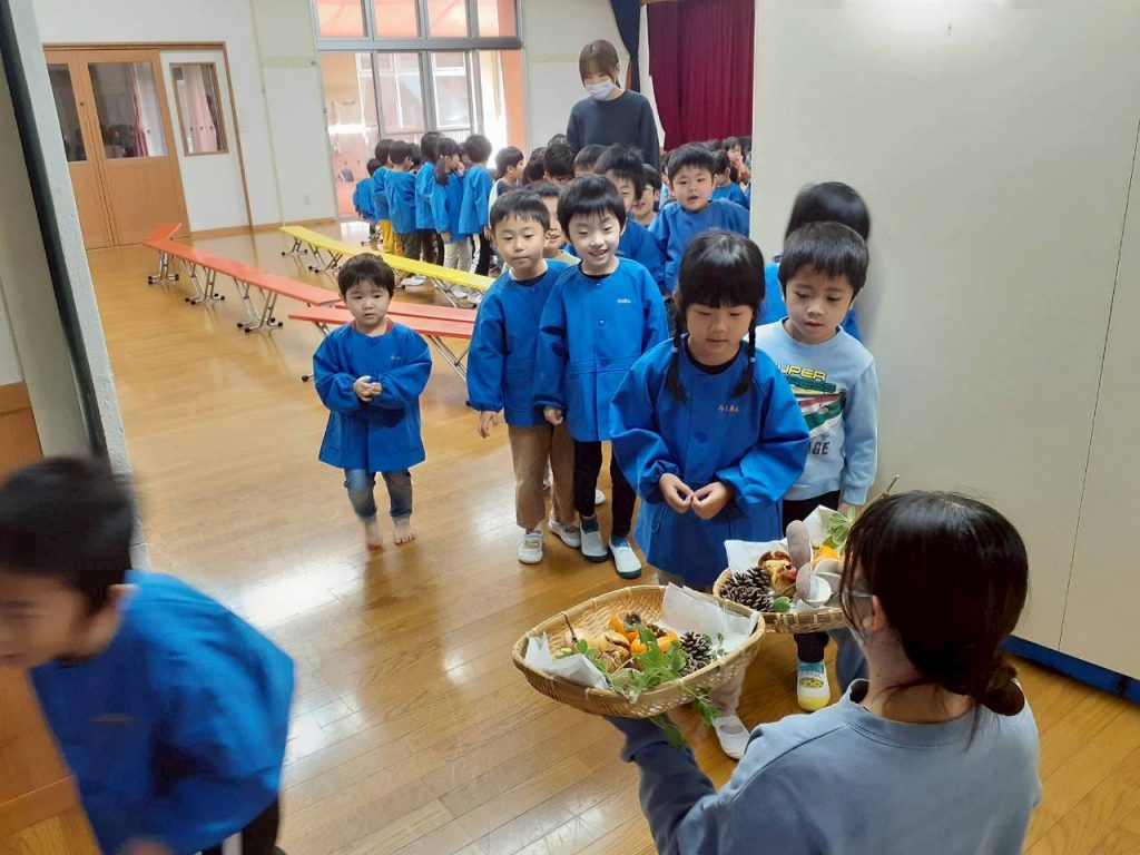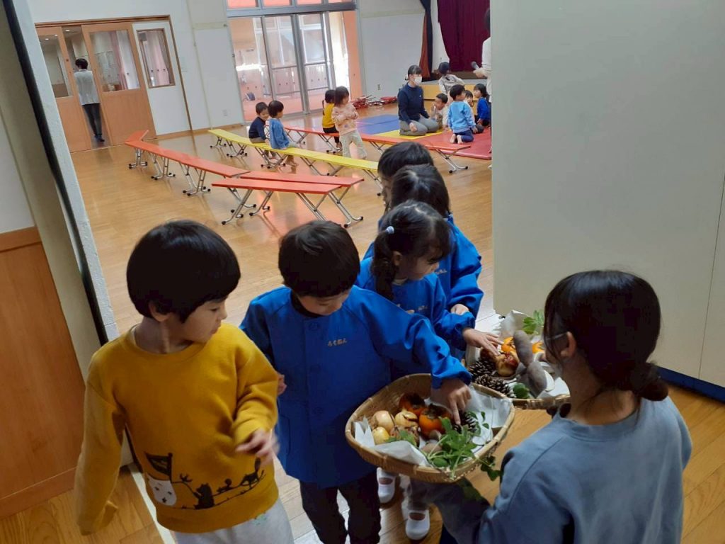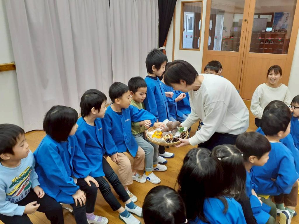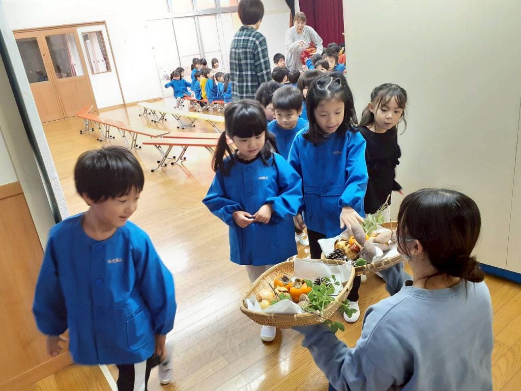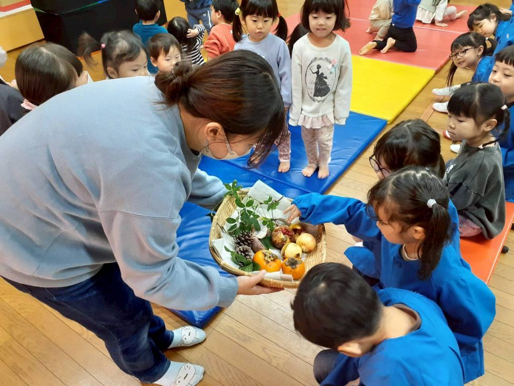 先日の総合避難訓練でかぶった防災頭巾や、秋の食べ物・木の実、運動会で見た万国旗等、箱から出てくるものに興味津々の子ども達。