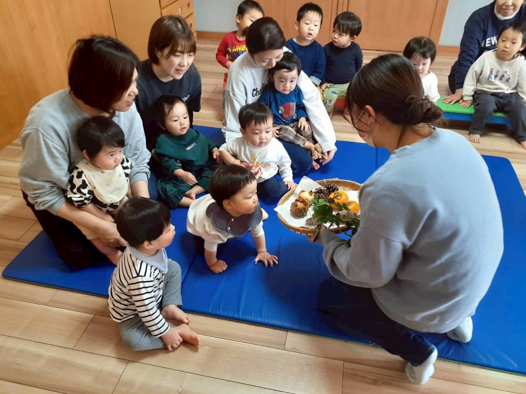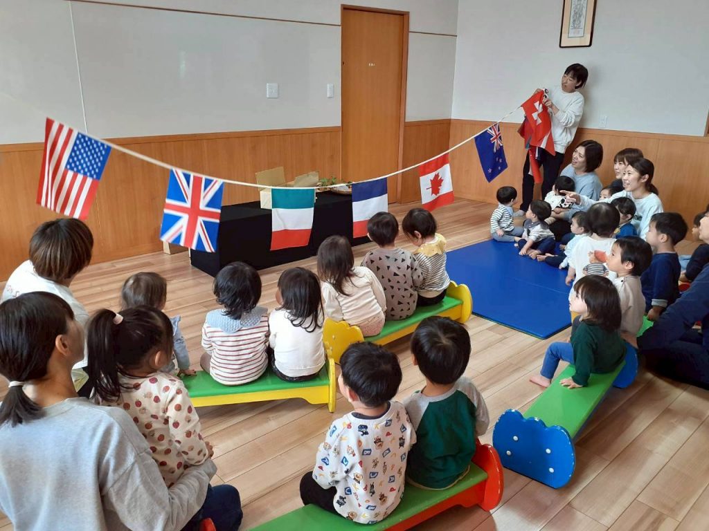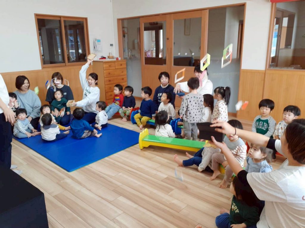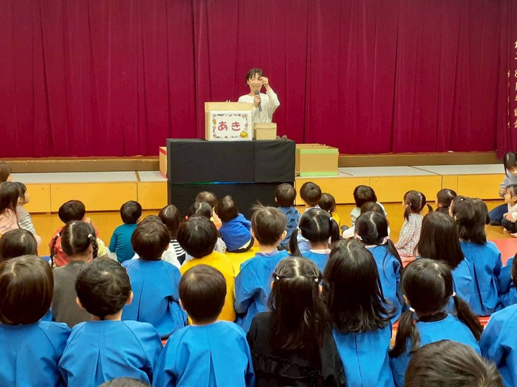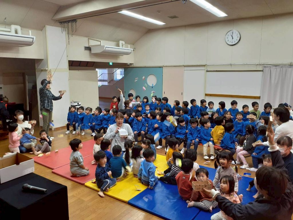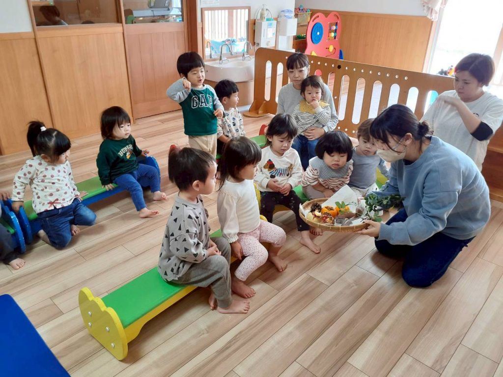 先日の総合避難訓練でかぶった防災頭巾や、秋の食べ物・木の実、運動会で見た万国旗等、箱から出てくるものに興味津々の子ども達。