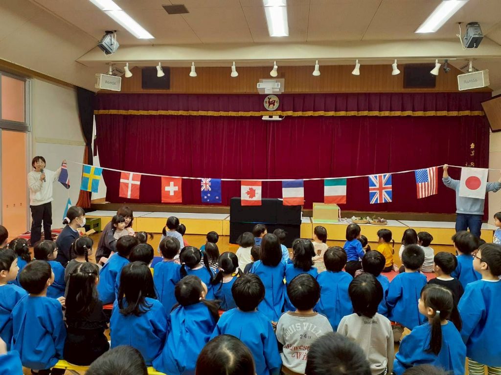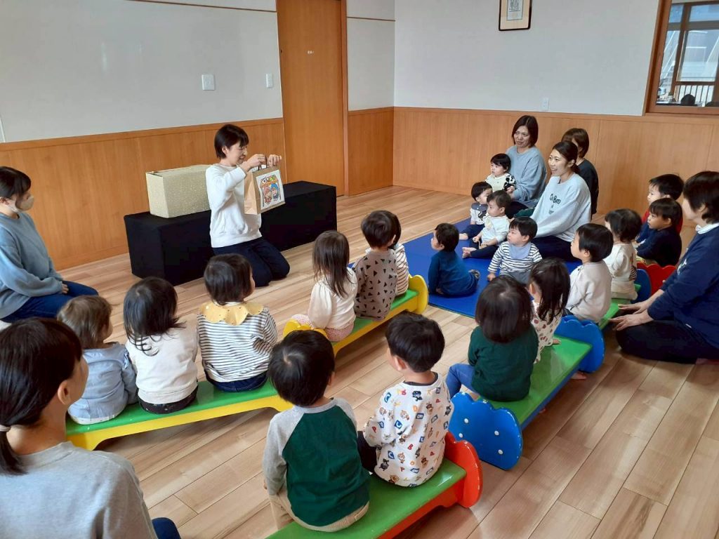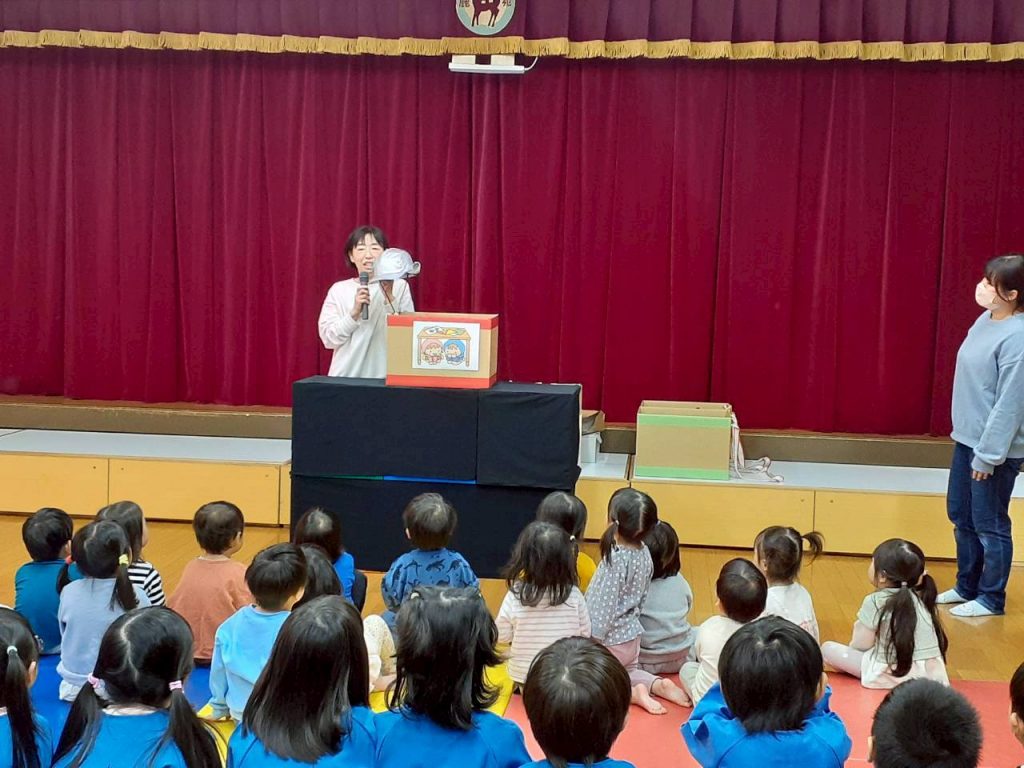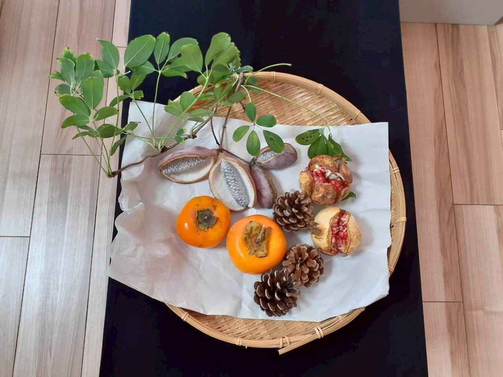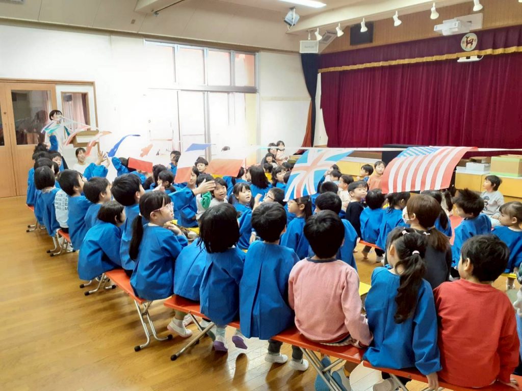 先日の総合避難訓練でかぶった防災頭巾や、秋の食べ物・木の実、運動会で見た万国旗等、箱から出てくるものに興味津々の子ども達。