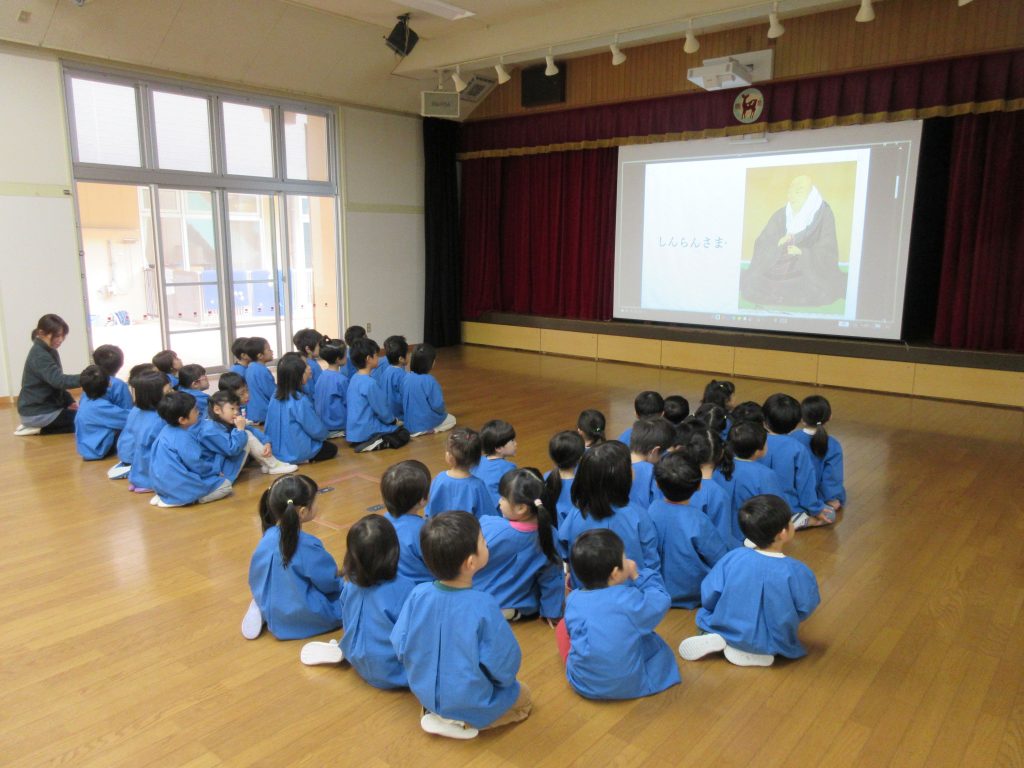 園内にて、『報恩講って何かな?』という事を写真やイラストを使って子ども達に知らせました。