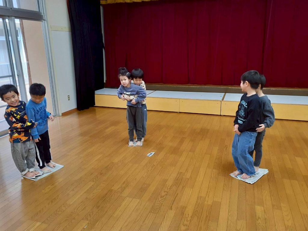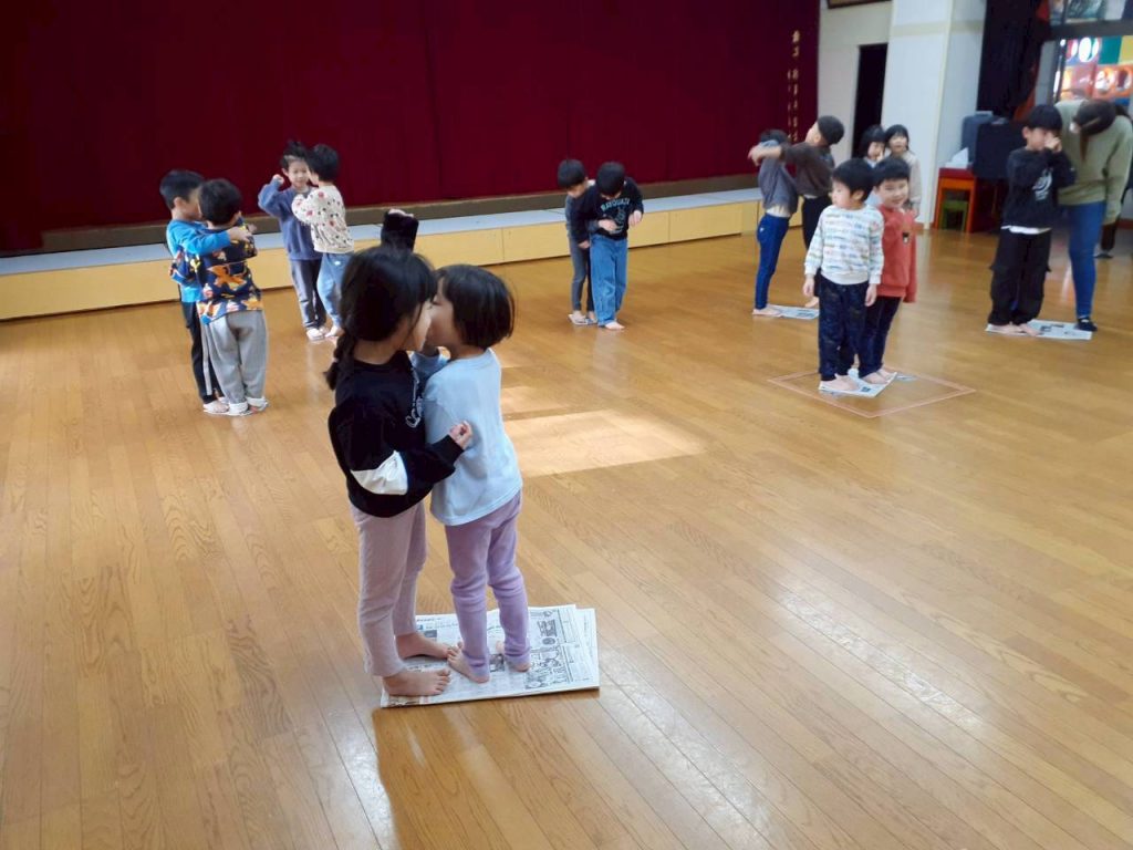 小さくなった新聞紙に2人で乗る事で、【バランス感覚】【空間意識】【社会性】の育ちに繋がります。