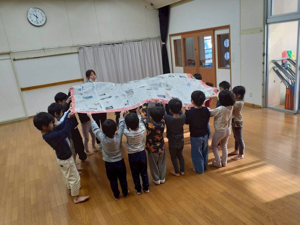 ジャンケンゲームを楽しんだ後は、全員で大きな新聞パラシュートを振りました。