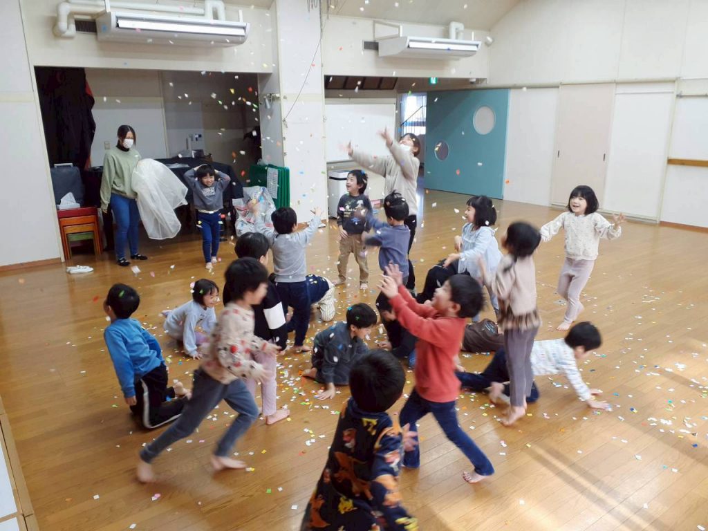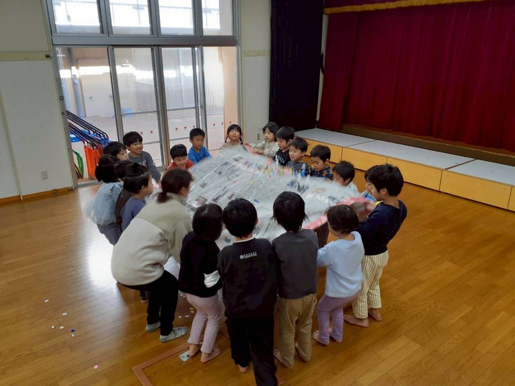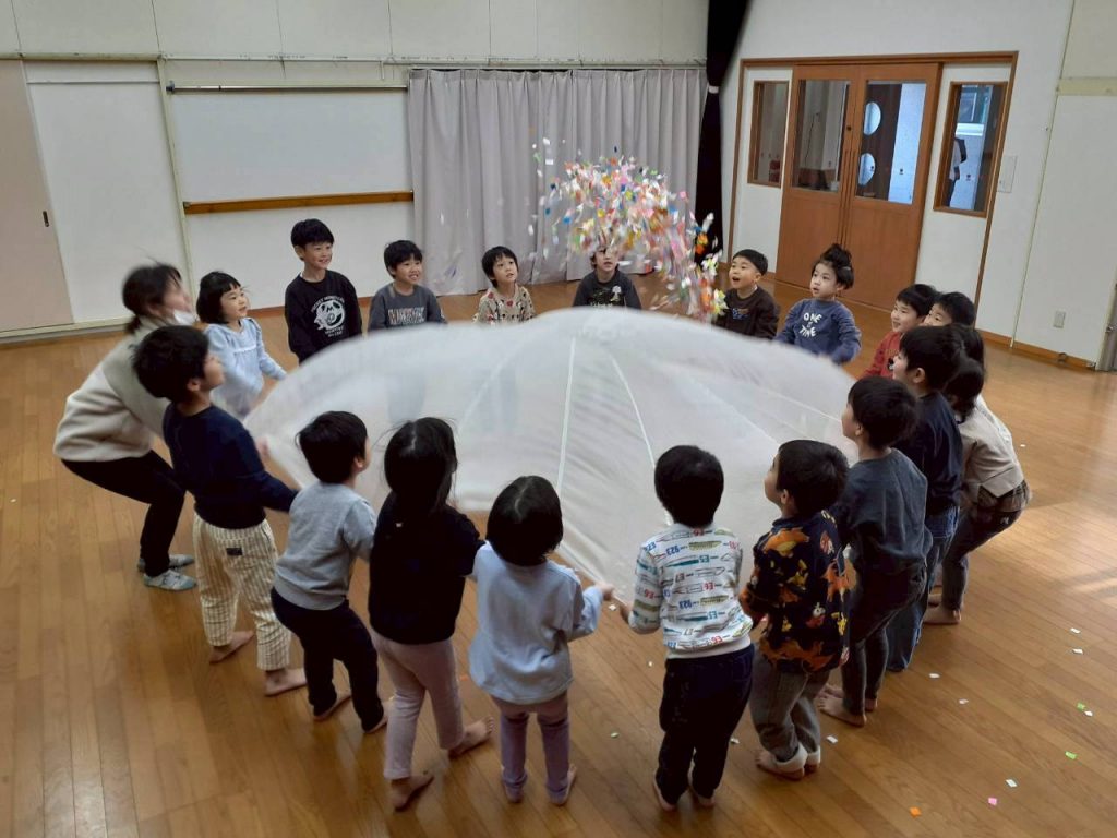子ども達の意見から、スクリーンパラシュートに紙吹雪を乗せて振りました。