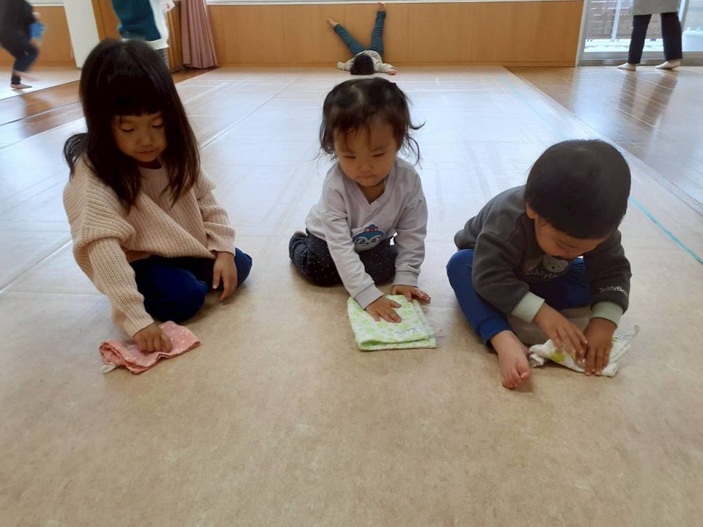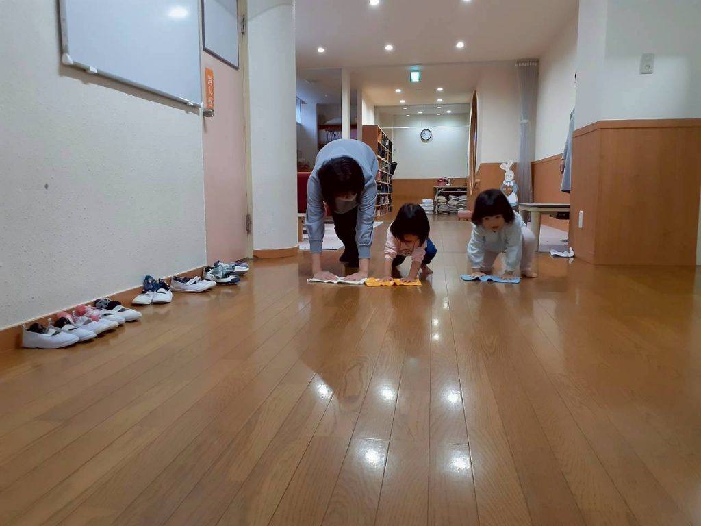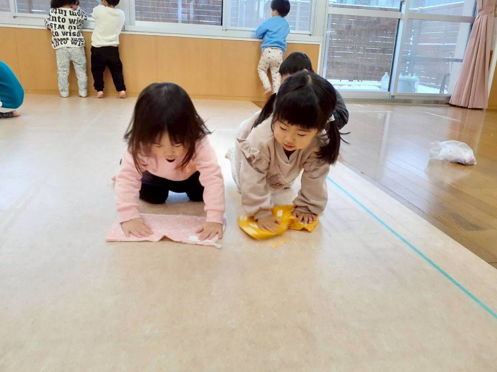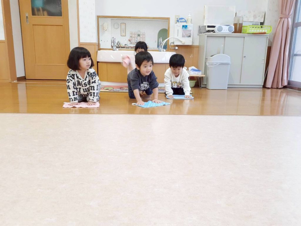 たくさん遊んだお部屋や廊下のお掃除をしました。「ありがとう」「きれいにな~れ」と言いながら雑巾で拭く事を楽しんでいた子ども達。