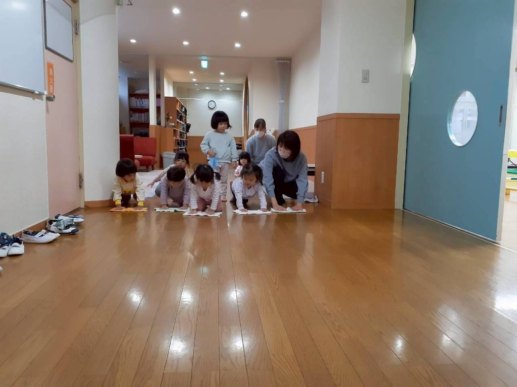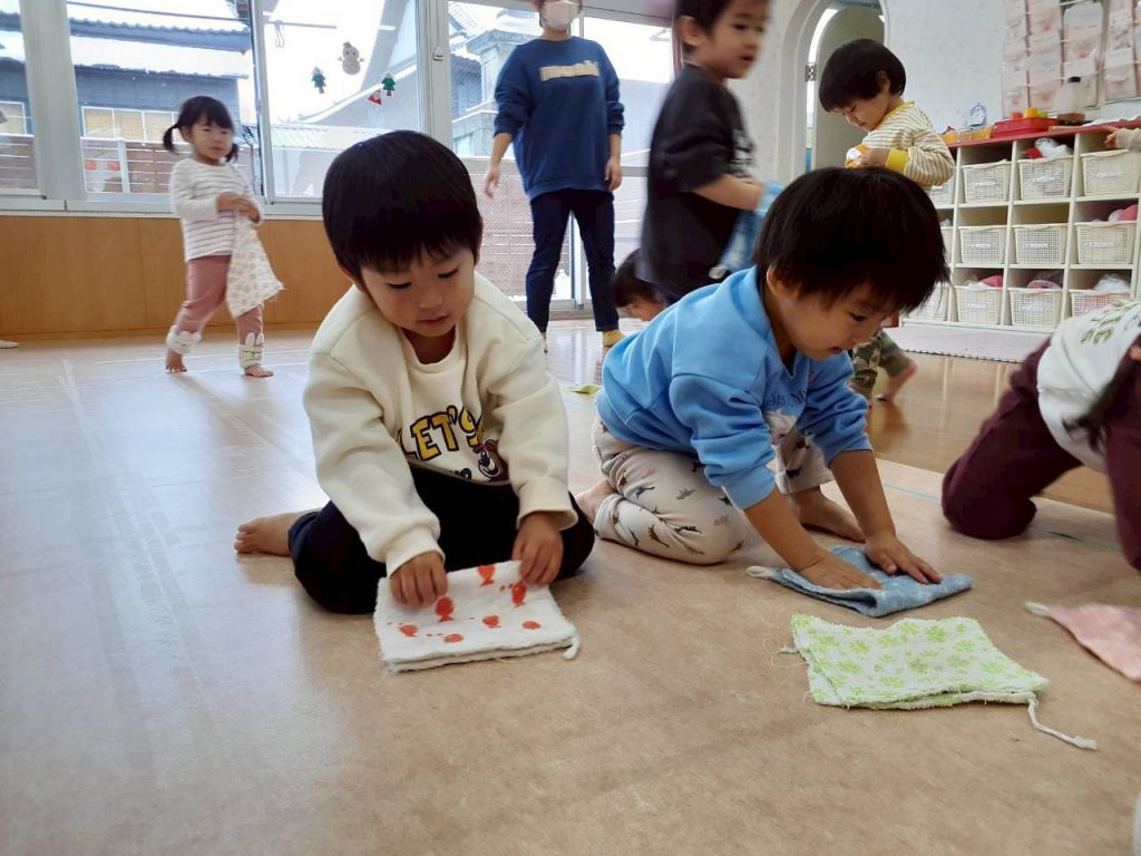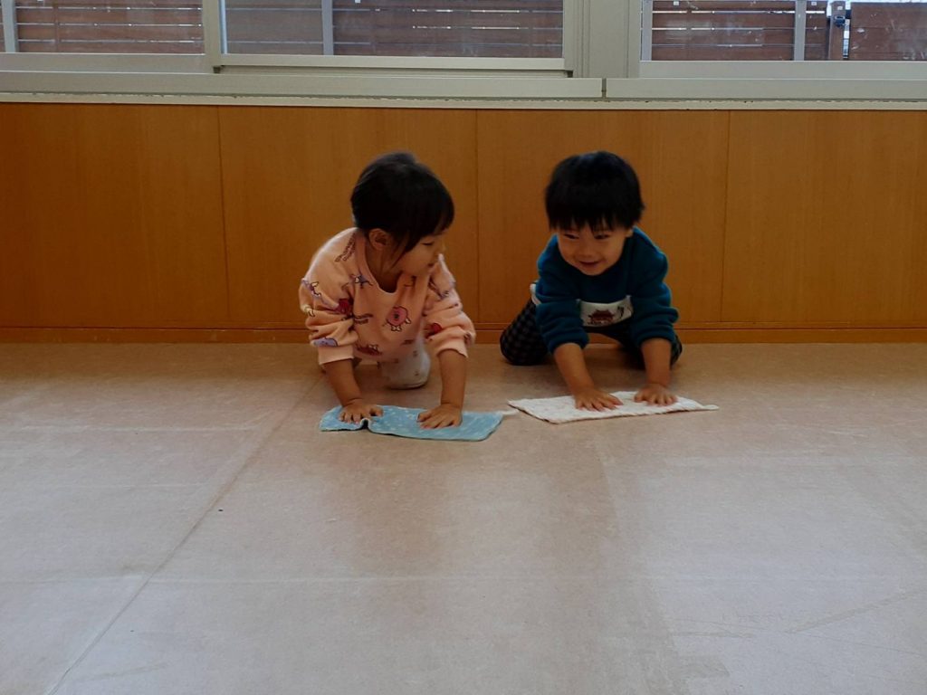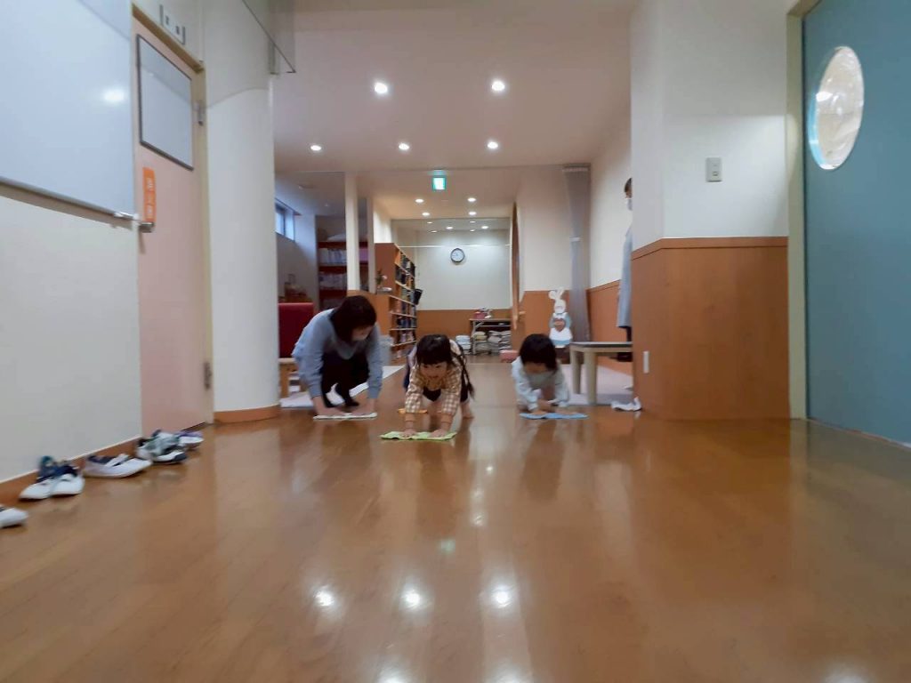 たくさん遊んだお部屋や廊下のお掃除をしました。「ありがとう」「きれいにな~れ」と言いながら雑巾で拭く事を楽しんでいた子ども達。