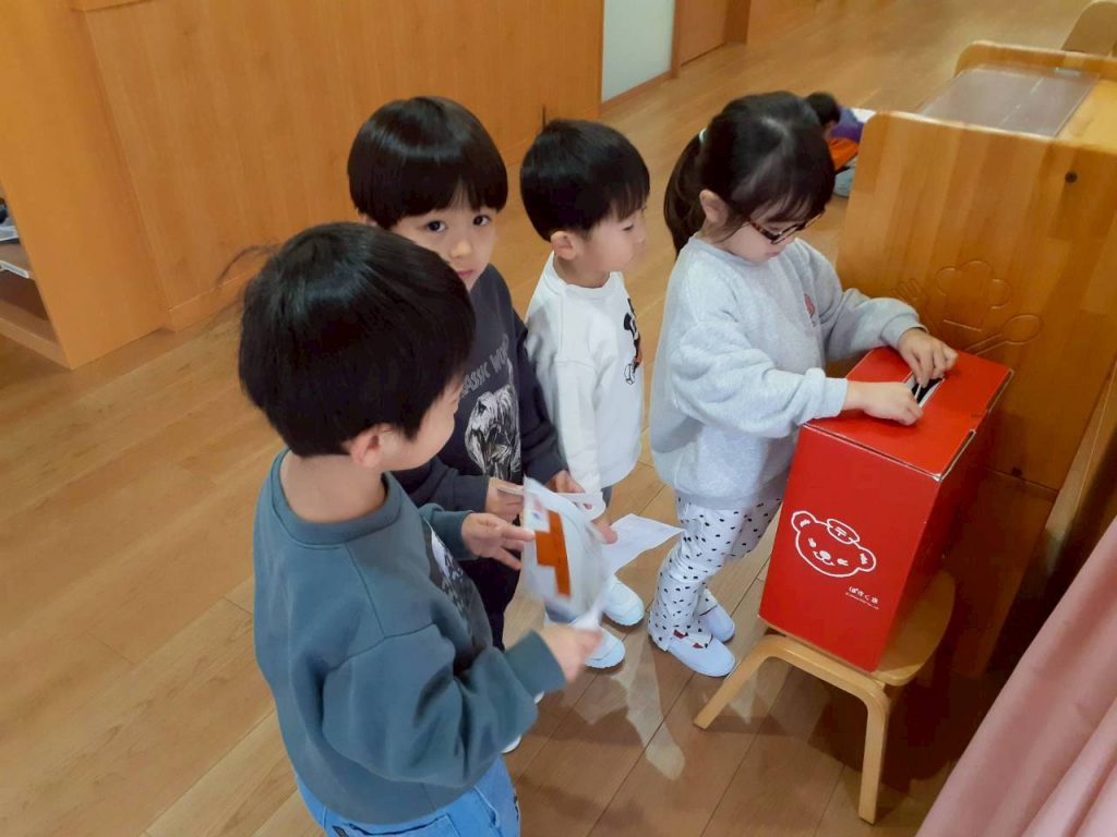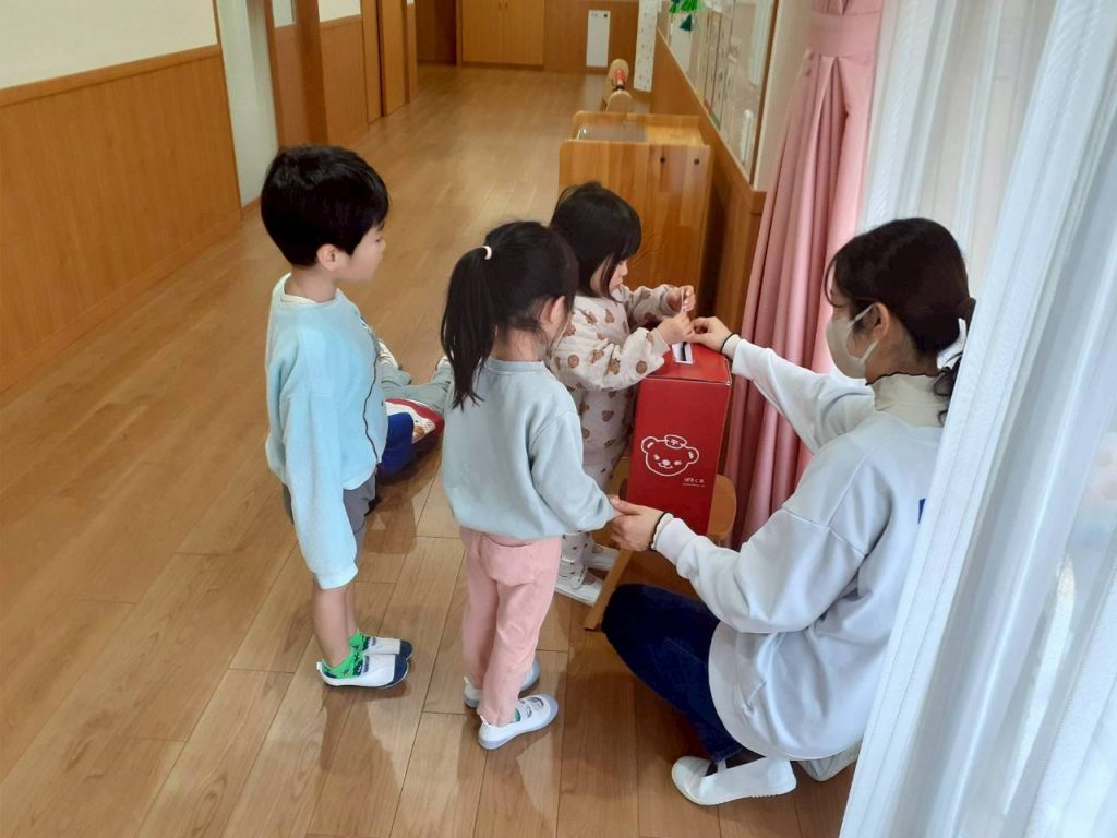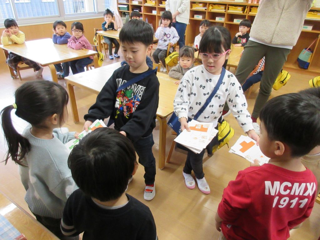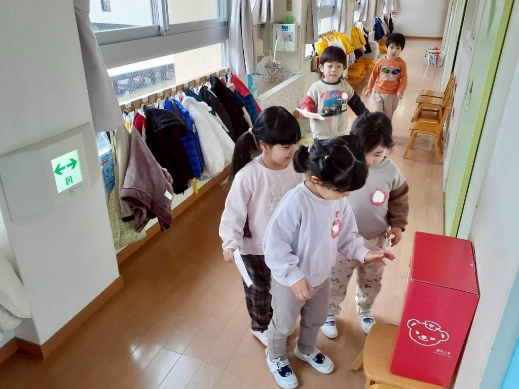 皆が投函した年賀状は、すみれ組さんが集めて、ひまわり組さんに届けました。