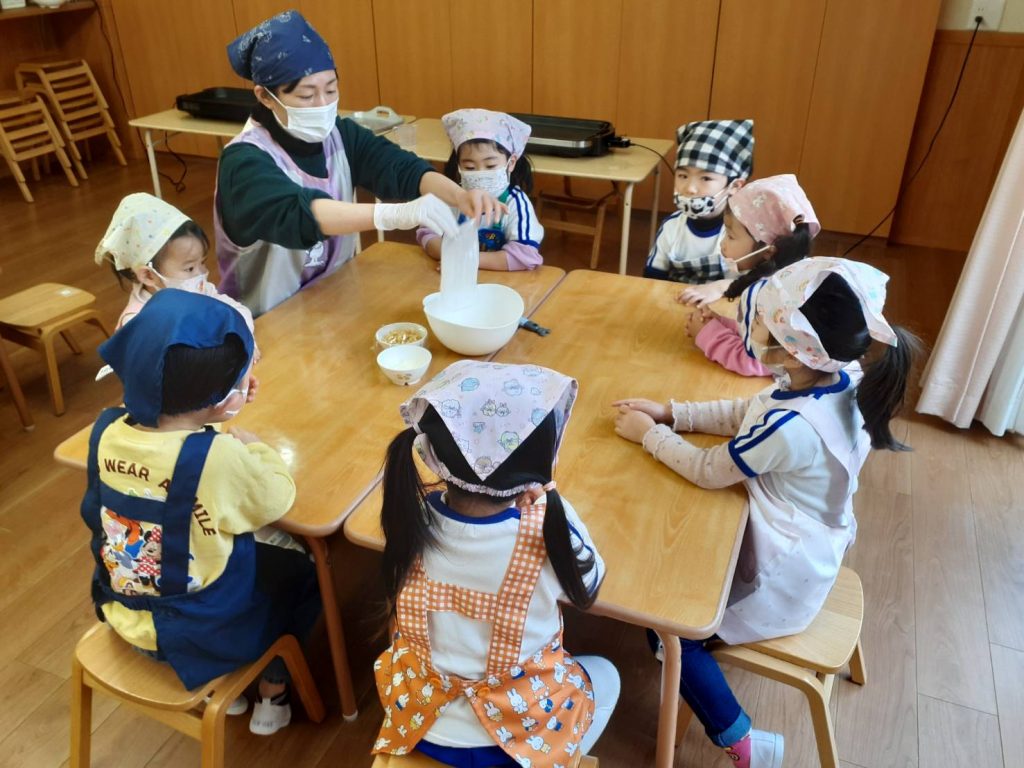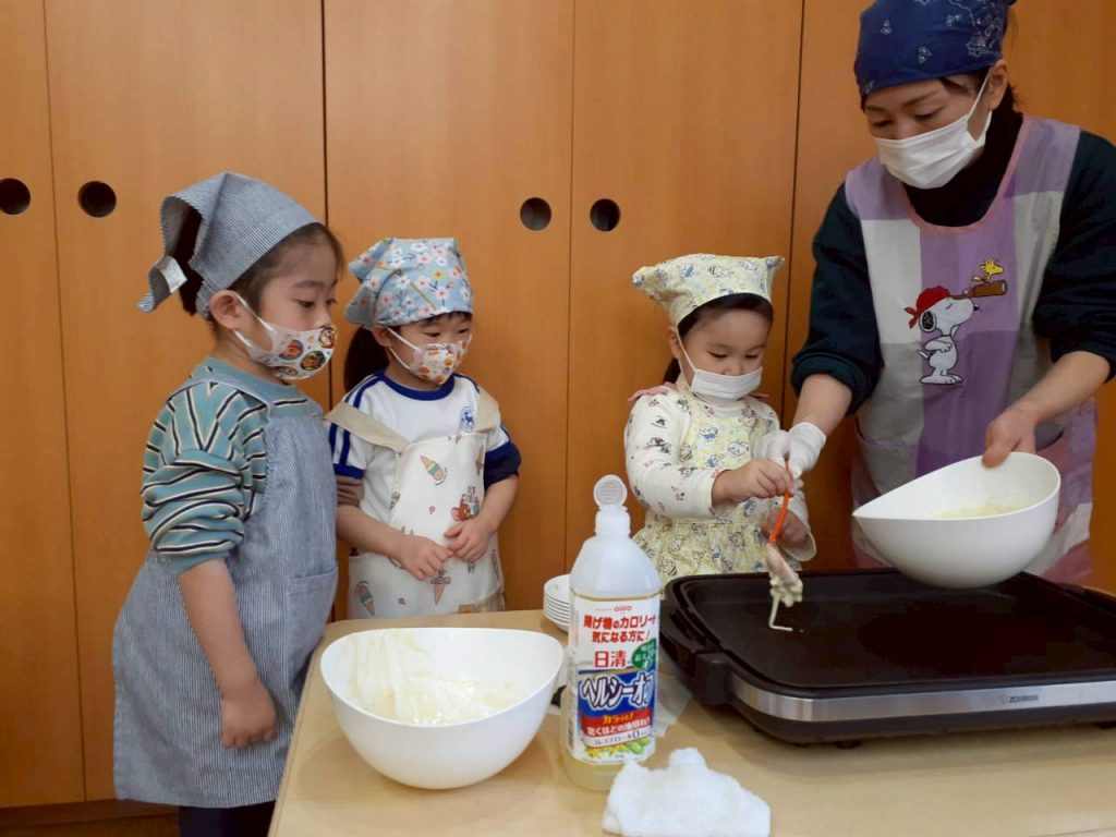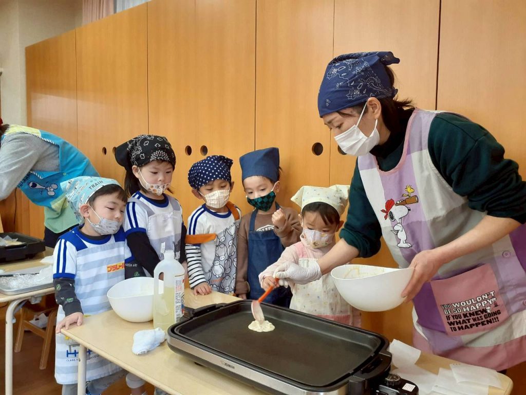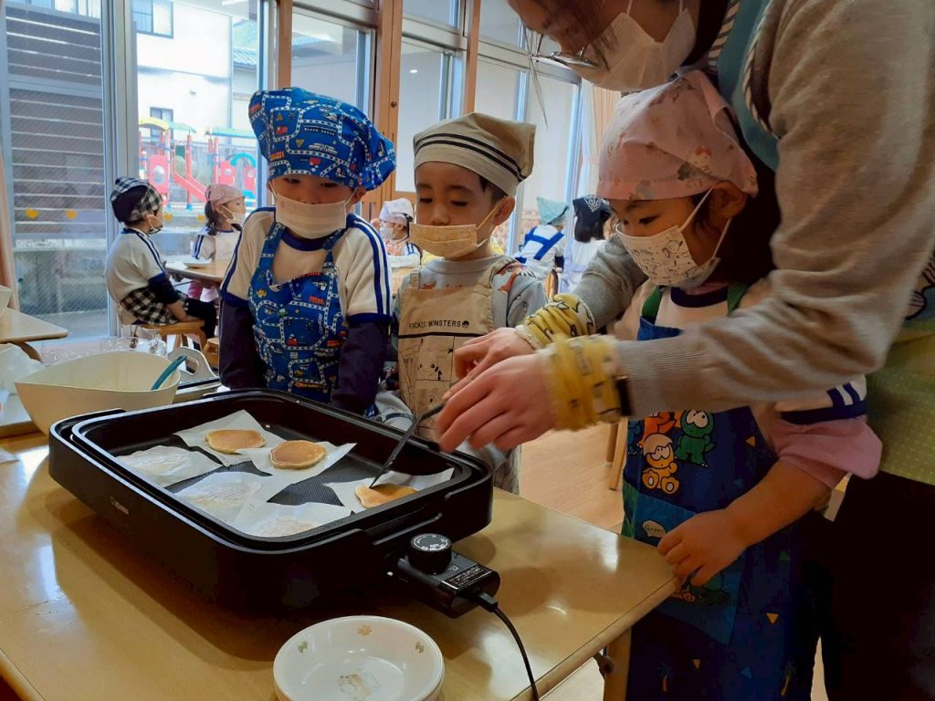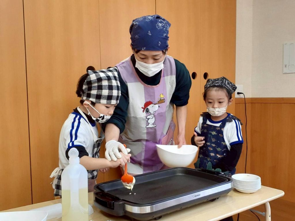 お友達にボウルを押さえてもらいながら混ぜたり、保育教諭と一緒にホットプレートで焼く事にも挑戦しました。
