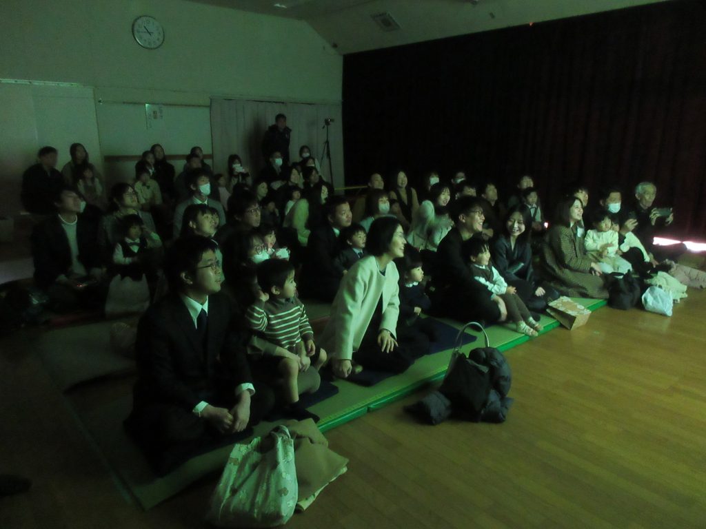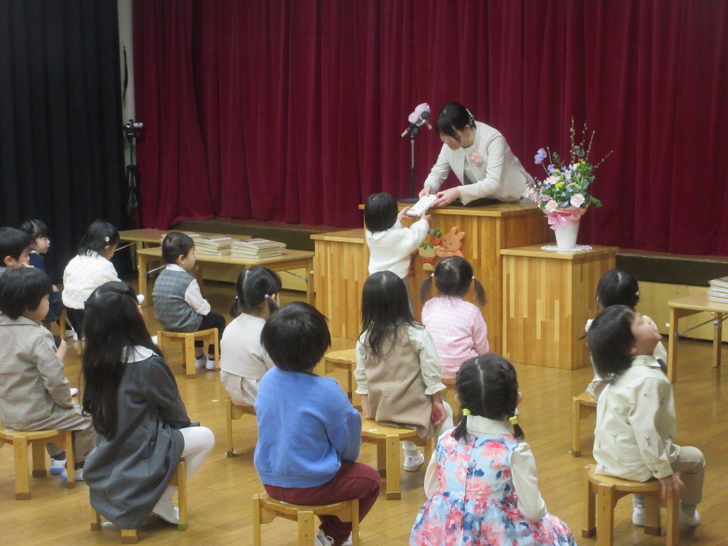 お家の方と一緒に登園し、離れる時に不安そうな表情のお子さんもいましたが、会中は大勢のお客さんがいる中、お返事をしたり、証書をとりに行ったりととても頑張っていました。