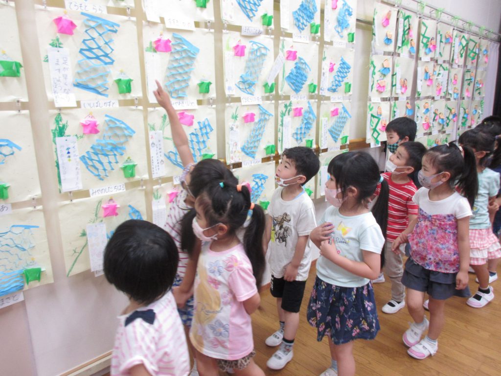 子ども達も、お友達の作品を見たり、自分の作品を見つけると「みて!ぼくのあったよ!」「ねがいごとかなうかな?」と話をしながら作品を見ていました。