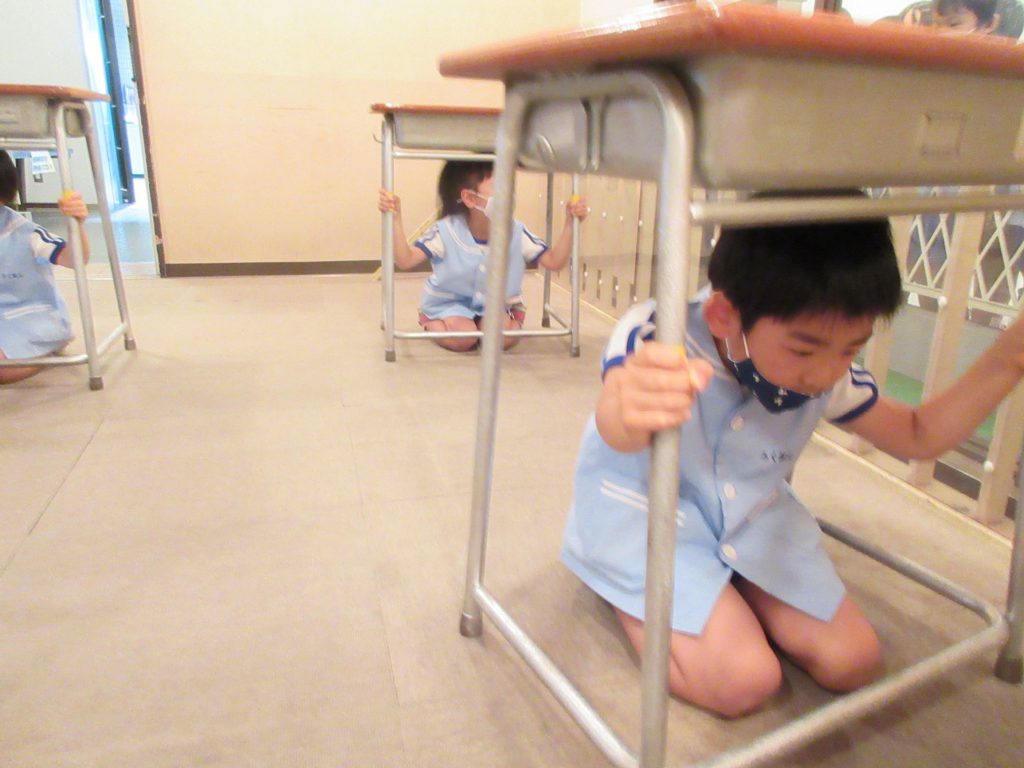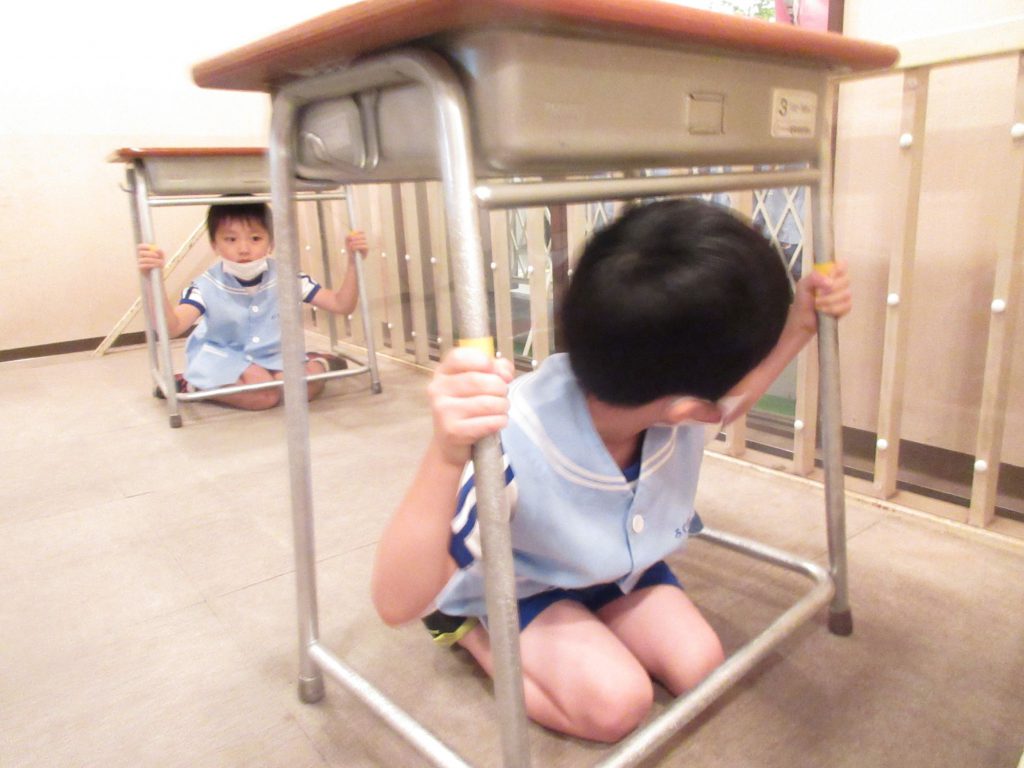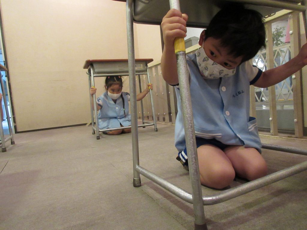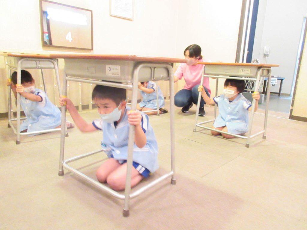 防災センターの方より『机の脚をしっかり持って、正座をし、口の中が切れないようにおしゃべりはしないよ』『机から頭が出ないように気を付けてね』と教えて頂きました。