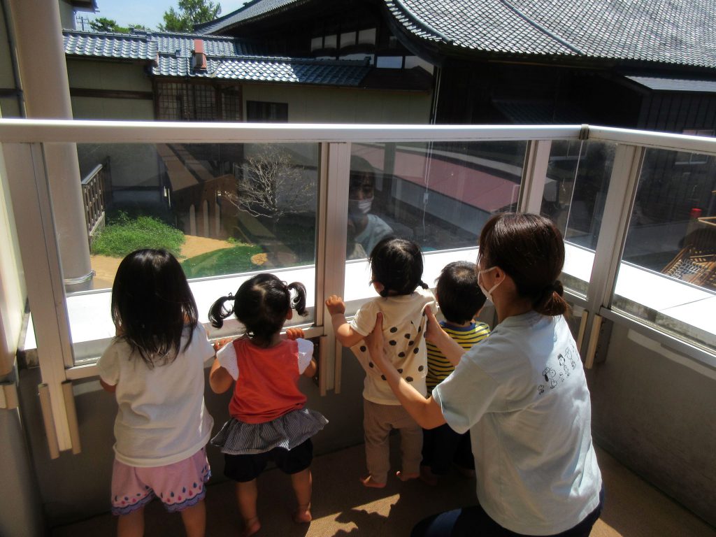園庭・中庭が完成したので、気候や気温をみて、ばら組さんはベランダから、もも組さん・たんぽぽ組さんは園庭や中庭に順番に出て見学をしました。