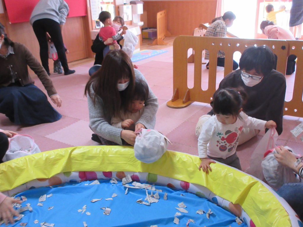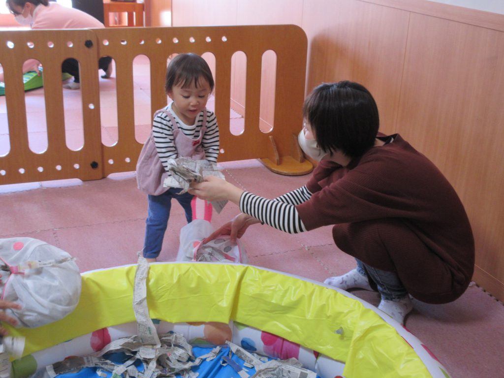 破った新聞をビニールプールの中に入れ、新聞プールを作りました。「いち、にの、さーん!」で上から降らせたり、身体部位(足や手)を隠したりして楽しんでいました。